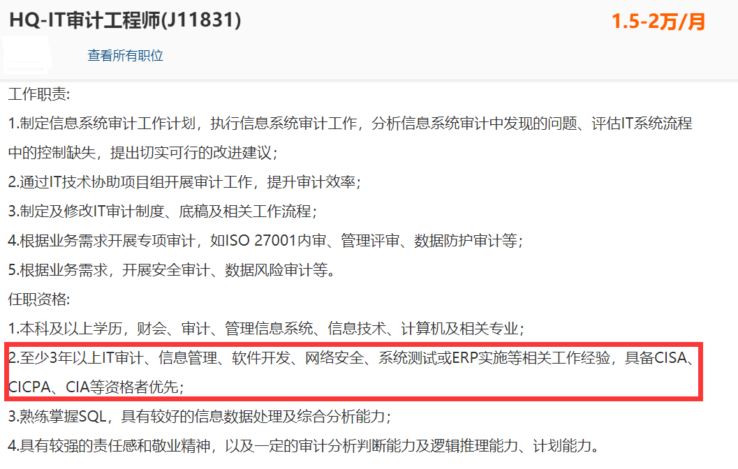 上海市2021年6月发布的上海市重点领域 (金融类) “十四五”紧缺人才开发目录中列出的紧缺程度达两颗星的金融审计人才,明确要求需要具有CISA。